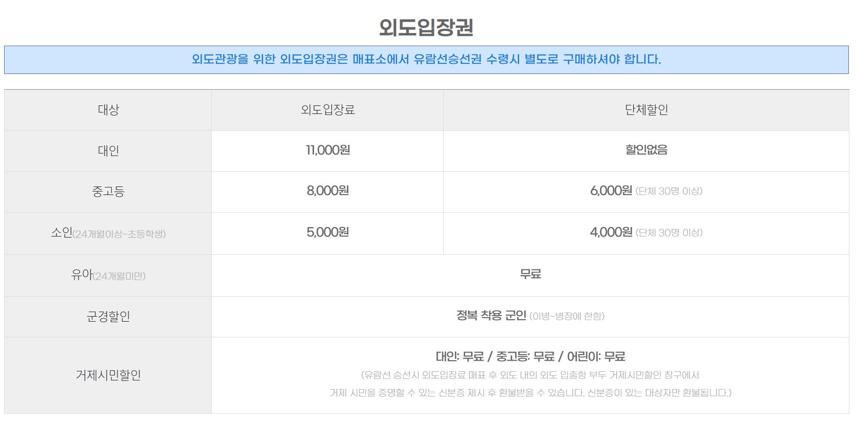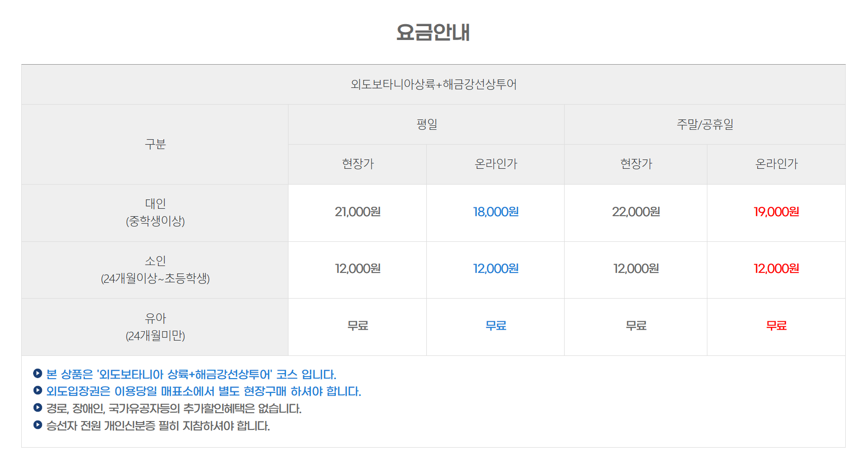 시간은 2시간 50분이 소요되며 도장포에서 해금강 선상관광을 한 후 외도 보타니아에 도착하는 상륙관광을 하게 됩니다. 다만, 날씨가 흐릴 경우 해금강 선상관광은 취소될 수도 있으며, 도장포 유람선 패키지 금액은 같습니다. 도장포 외도 유람선 요금은 아래 표시한 내용을 천천히 읽어 보시고 외도 보타니아 관광은 예매를 별도로 해야 된다는 점을 알고 가시기 바랍니다.