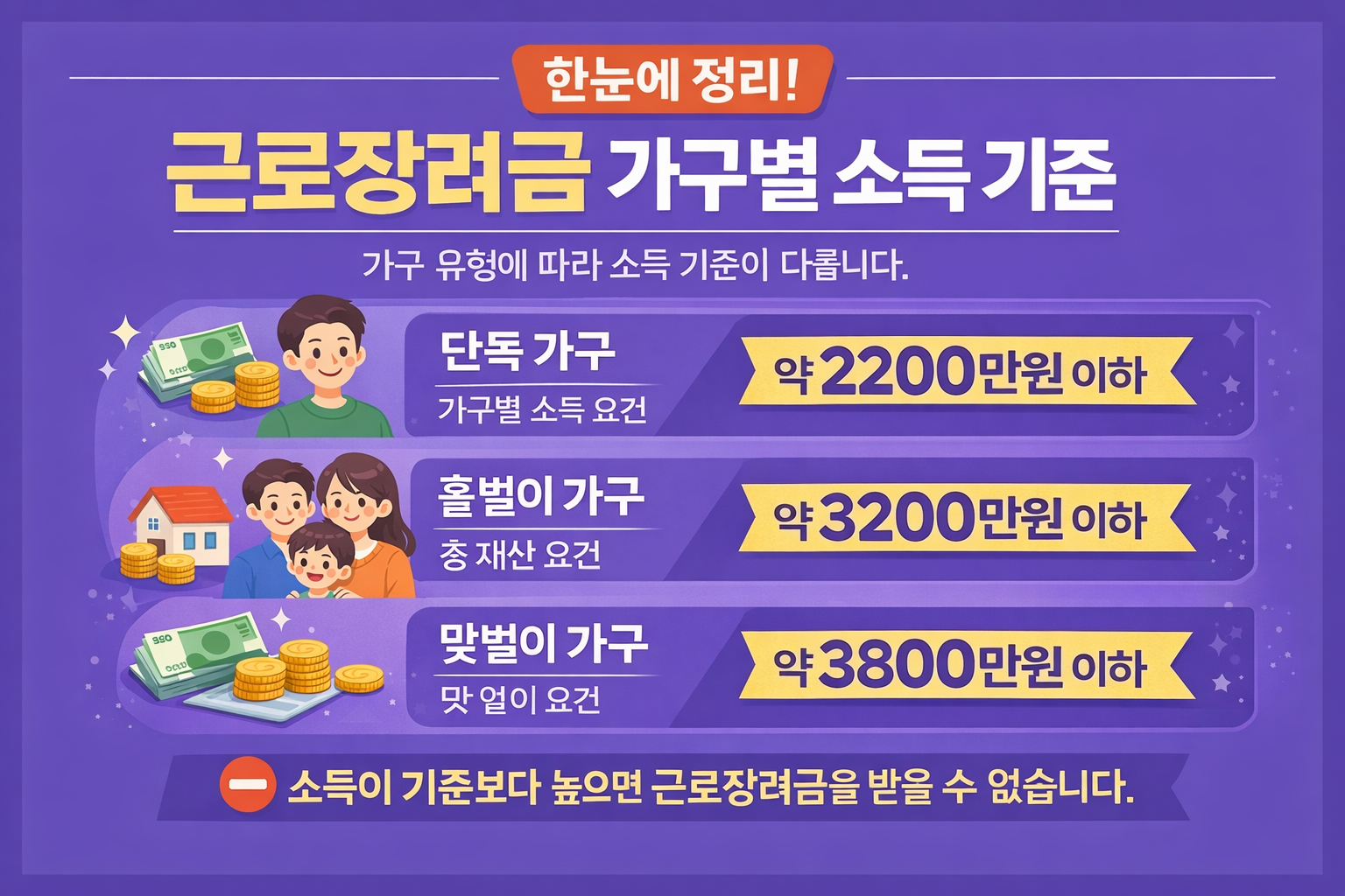 근로장려금은 가구 유형에 따라 소득 기준이 다릅니다.