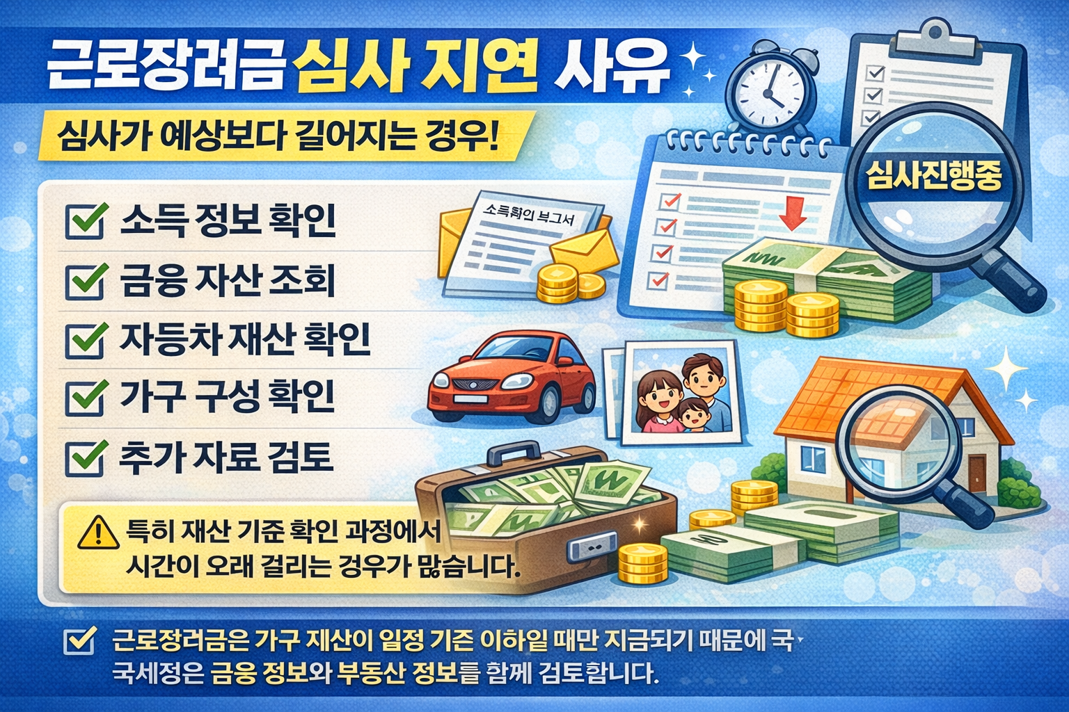 근로장려금은 가구 재산이 일정 기준 이하일 때만 지급되기 때문에 국세청은 금융 정보와 부동산 정보를 함께 검토합니다.