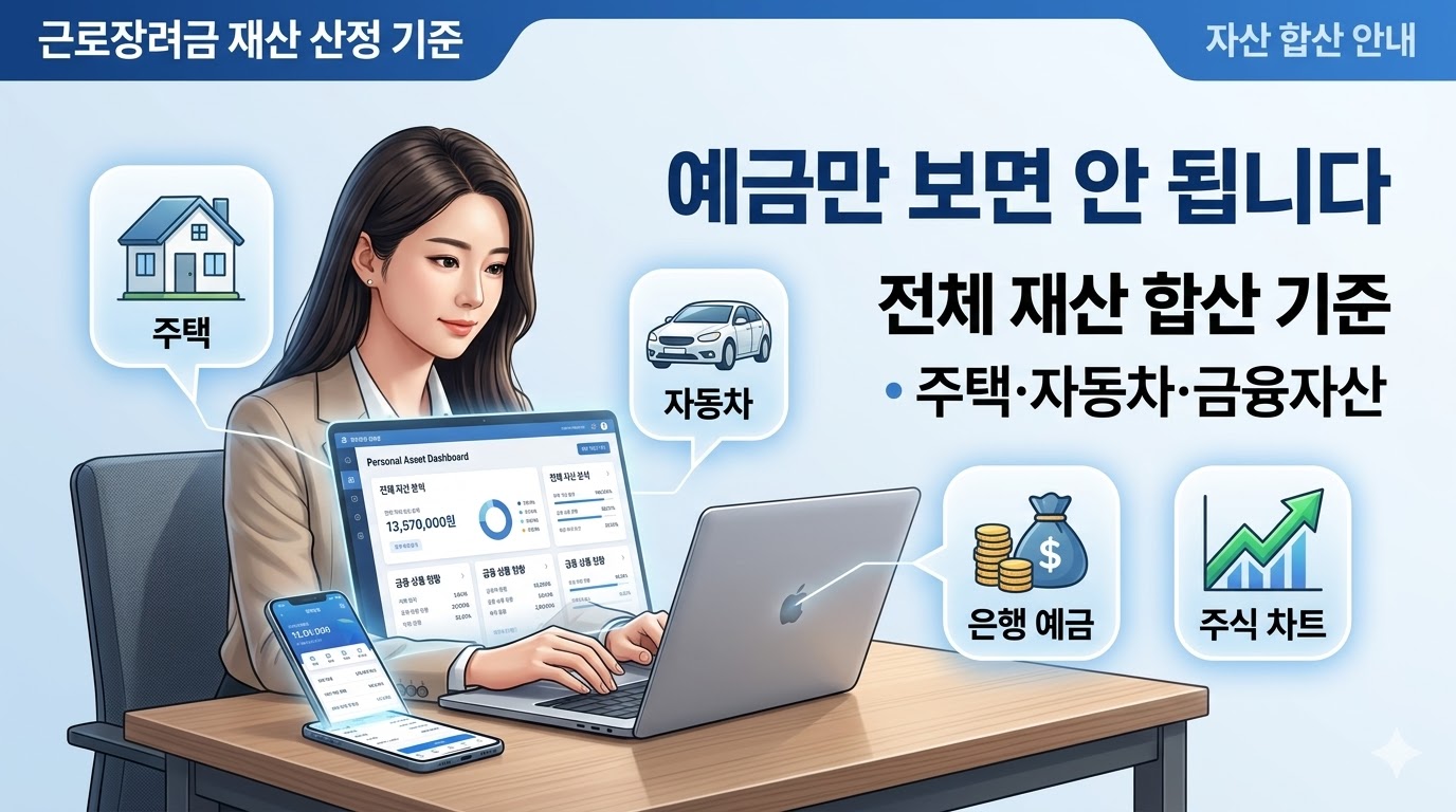 근로장려금은 예금만 많다고 바로 탈락하는 구조가 아닙니다. 하지만 예금은 분명히 재산에 포함되기 때문에, 주택·자동차·전세금·적금·주식까지 모두 합산해서 봐야 합니다.