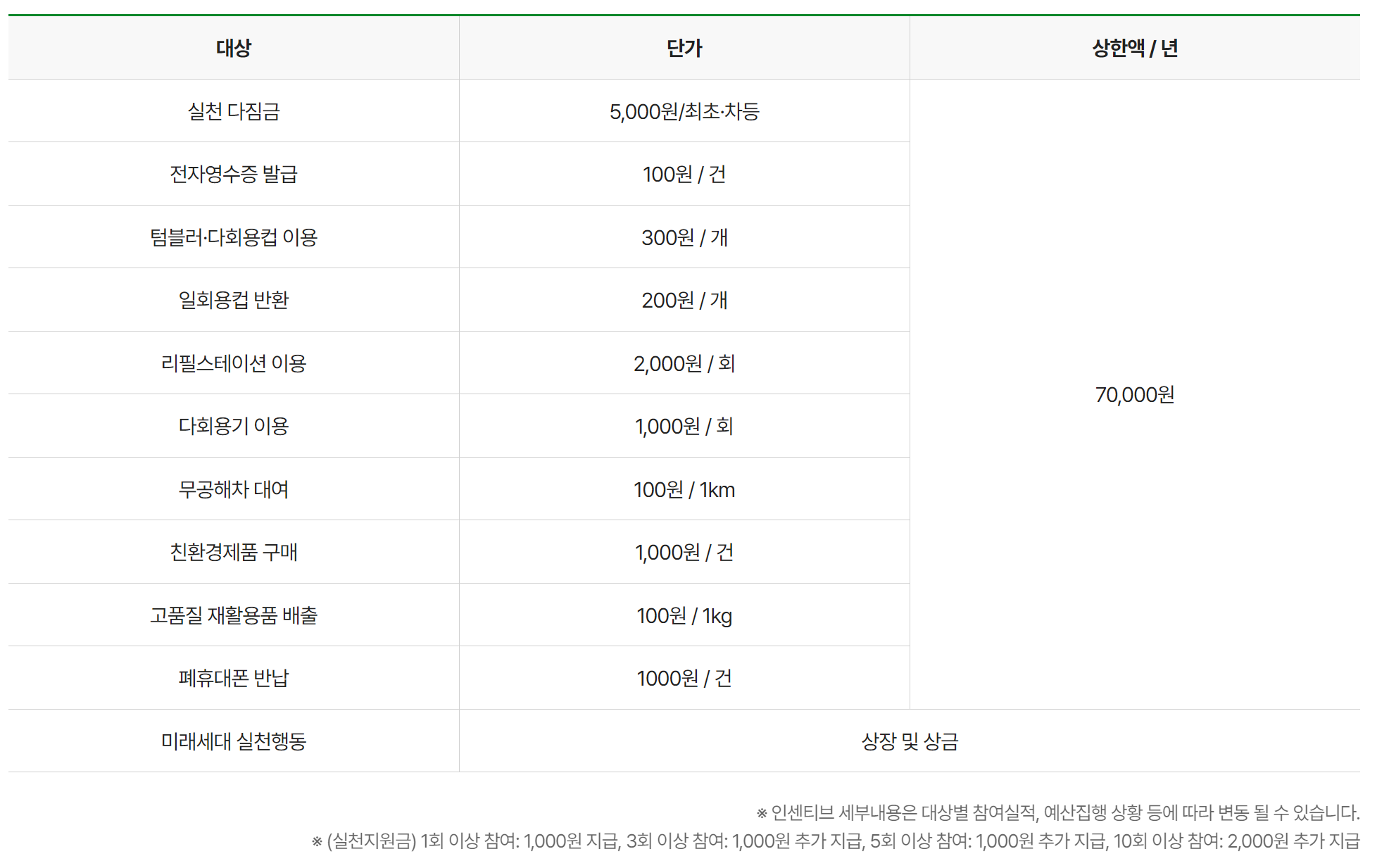 홈페이지 외에도 실천 챌린지 이벤트 등 각종 행사 정보 역시 이곳에서 제공되니 자주 들러보는 것이 좋겠습니다. 인센티브는 현금, 신용카드 포인트 등으로 지급되는데, 종류에 따라 지급 시기와 방법이 다르므로 유의해야 합니다.