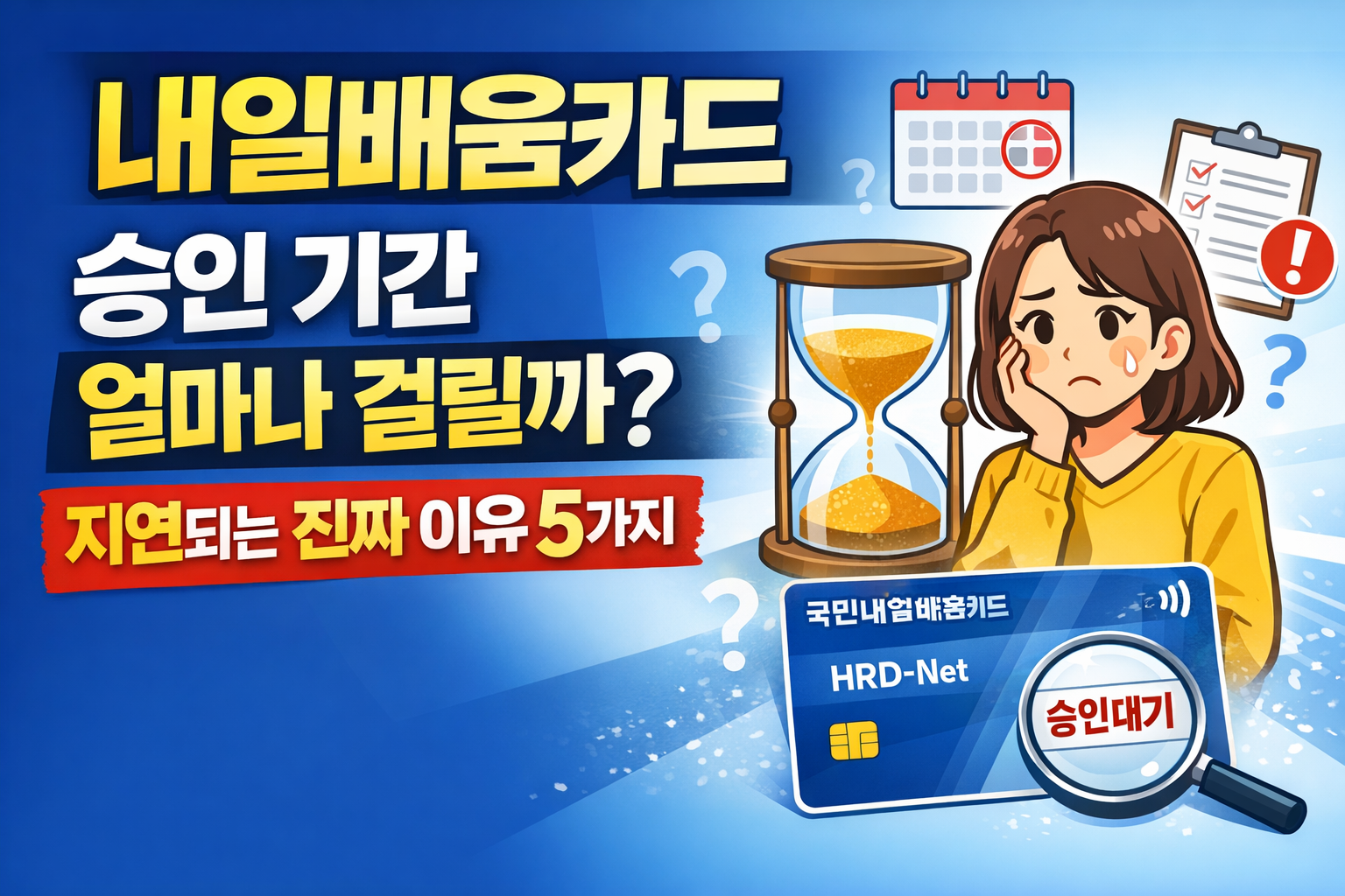 내일배움카드 신청 후 가장 많이 묻는 질문은 “승인까지 얼마나 걸리나요?”입니다. 평균 소요 기간부터 지연되는 이유, 빠르게 승인 받는 방법까지 한 번에 정리했습니다.