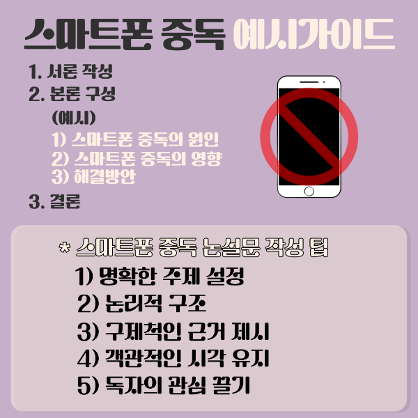 이번 글은 스마트폰 중독 논설문 작성에 대해 짤막하게 예시를 들어 글을 써보았습니다. 제가 말씀드린 예시가 다 맞는지 않겠지만 글을 쓰셔야 하는분들에게 조금이나 도움을 드리고자 글을 작성해 보았습니다.
