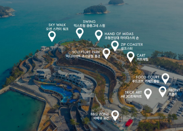 체험 코스로는 카트체험, 짚코스터, AR 3D뮤지엄 소설, 조각공원 풍경, 전망대 마이다스의 손, 스윙 등이 있습니다.