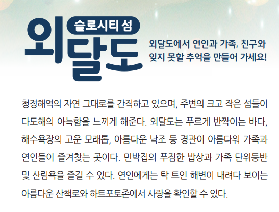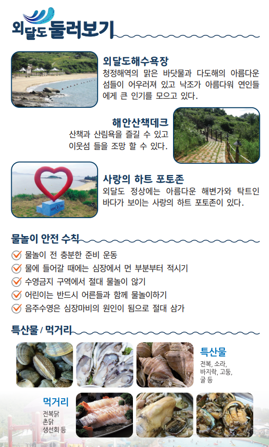 깨끗한 해변과 아름다운 자연환경을 자랑하며 국토해양부 선정으로 전국에서 휴양 하기 좋은 섬 Best30에 선정되었습니다. "슬로시티 섬 외달도"는 휴양지로서 관광객들의 소중한 추억을 더욱더 오랫동안 기억에 남게 해 줄 것입니다.