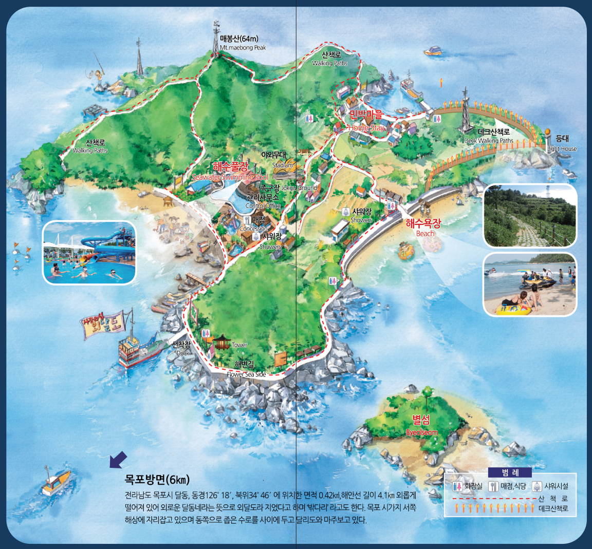 위치는 목포 시가지 서쪽 해상에 자리잡고 있으며 동쪽으로 좁은 수로를 사이에 두고 달리도와 마주 보고 있습니다.