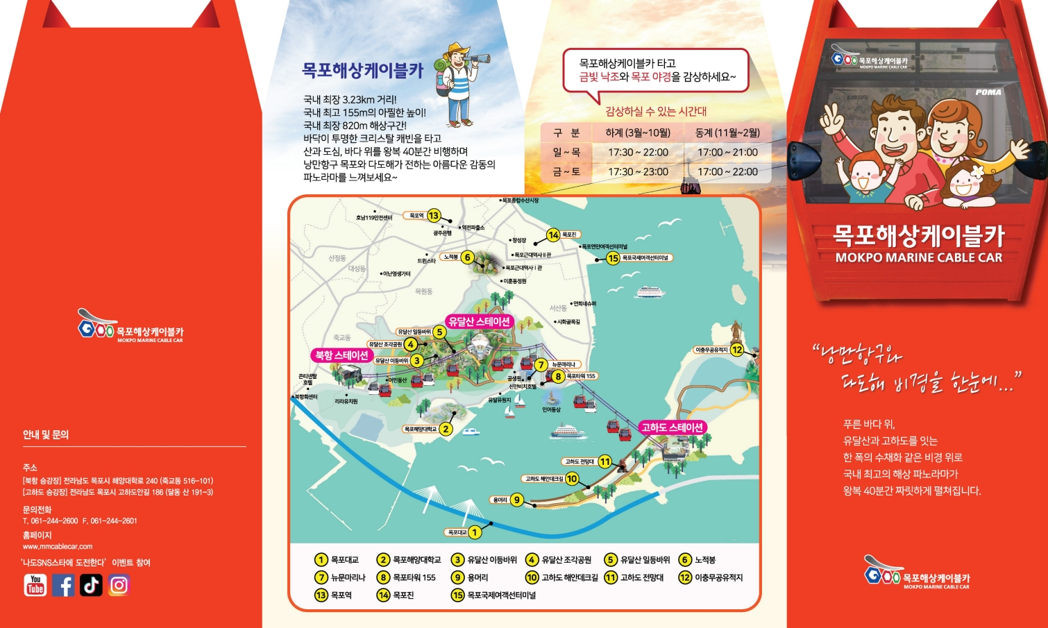 목포해상 케이블카는 슬로우시티 목포의 옛 중심지인 원도심과 북항, 유달산은 물로 고하도를 비롯한 다도해의 아름다운 풍경을 한눈에 살펴 볼 수 있는 해양 관광, 레저 문화관광의 새로운 중심축이며, 유달산의 지형적 특성과우수한 경관을 고려하여 원도심과 다도해상 전제츨 조망할 수 있는 국내 최장 3.23kn 국내 최고 높이 155m를 자랑합니다.