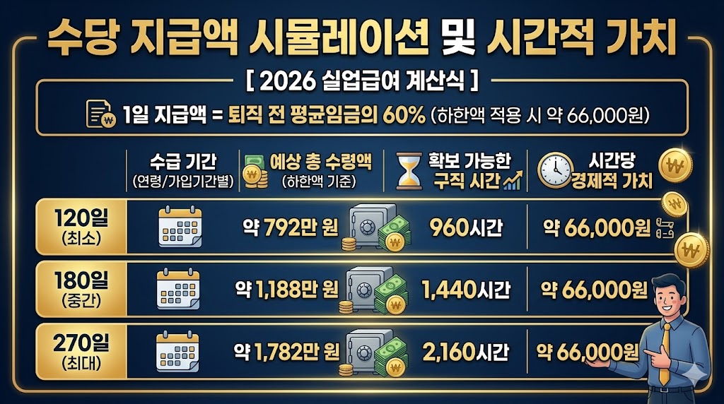 | 수급 기간 (연령/가입기간별) | 예상 총 수령액 (하한액 기준) | 확보 가능한 구직 시간 |