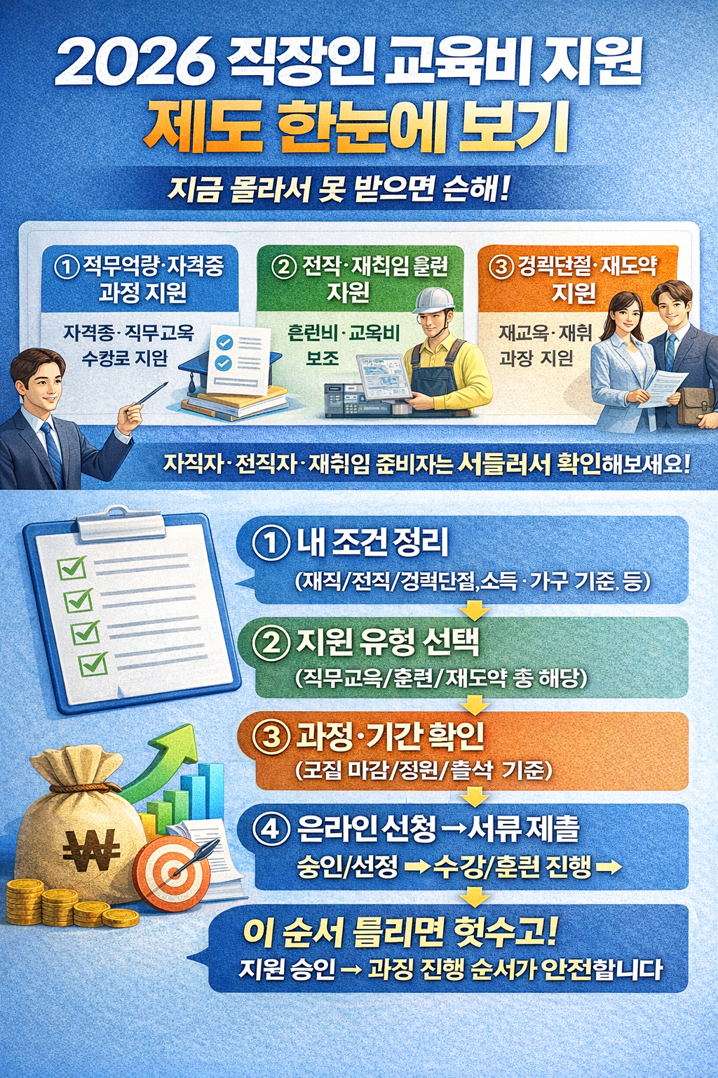 👉 결론적으로, 직장인 교육비 지원은 “몰라서 못 받는” 경우가 많습니다. 내 조건을 먼저 정리하고, 신청 순서대로 진행하면 교육비 부담을 현실적으로 줄일 수 있습니다.