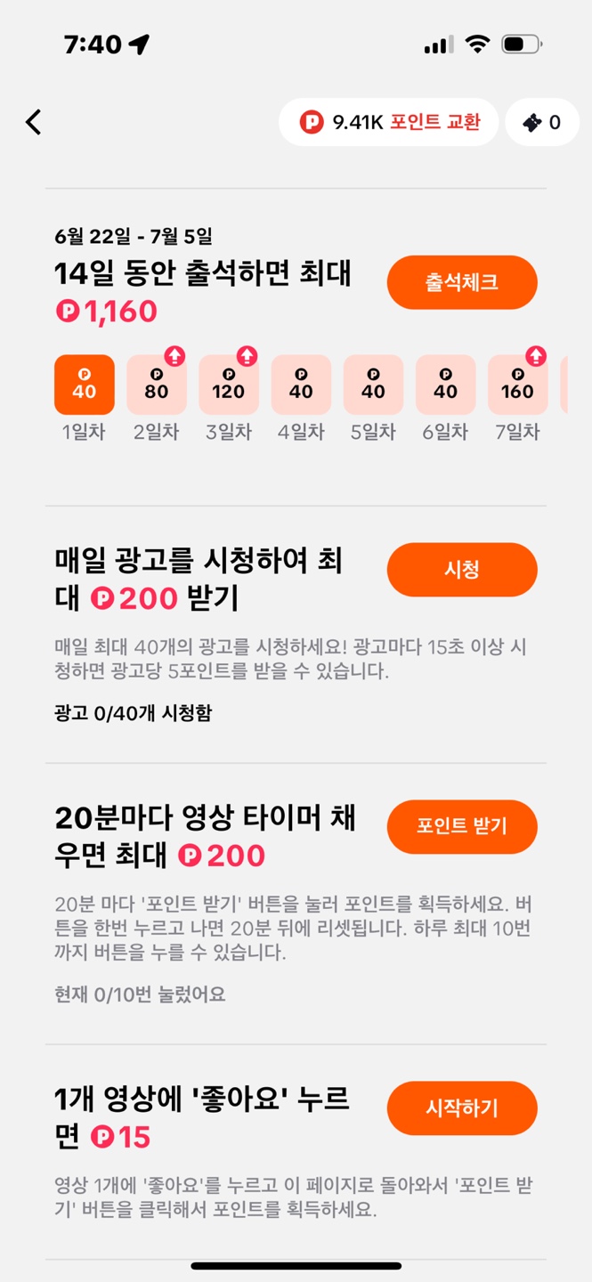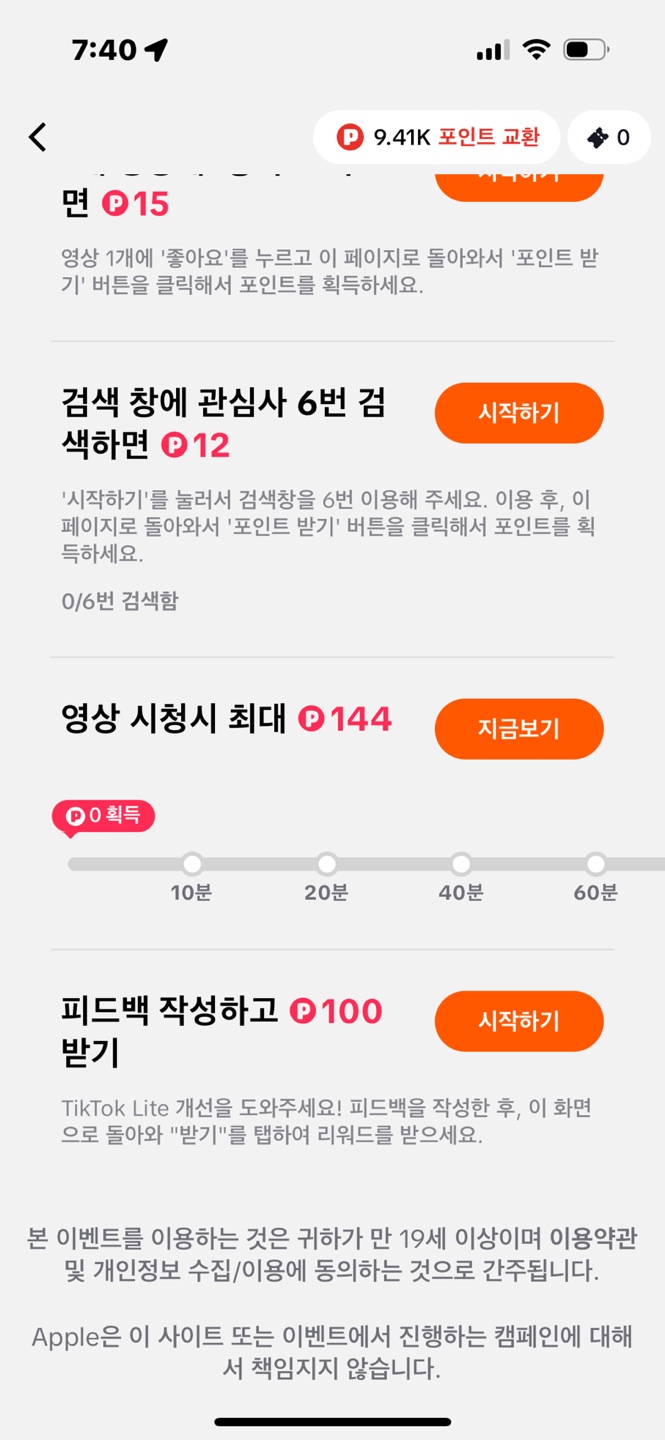 3. 포인트 적립 및 포인트 인출 화면이 나오면 밑으로 내리면 틱톡을 시청하면서 돈을 적립할수 있는 아이콘들이 나옵니다.