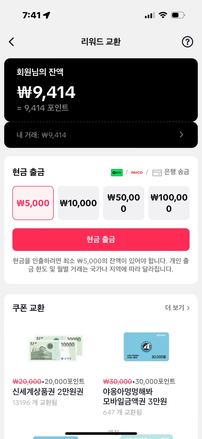 4. 출금 : 일정 금액 이상의코인을 모으면 현금으로 출금할 수 있습니다. 출금 신청을 하면 본인 계좌로 입금 됩니다.