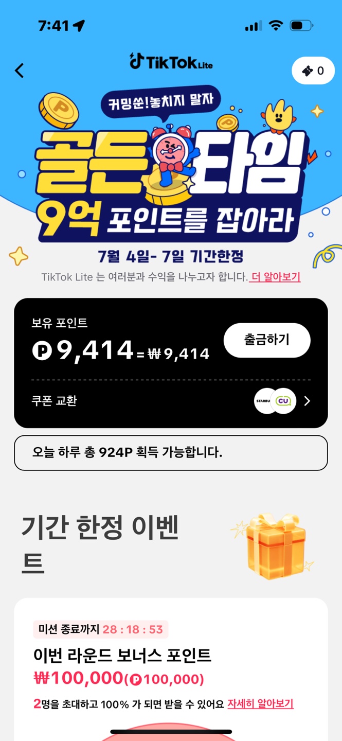 틱톡 라이트에서 적립한 용돈은 일정 금액 이상이 되면 현금 및 CU포인트로 인출or전환 할 수 있습니다. 하지만 인출 가능한 금액과 조건이 있으므로 미리 체크해 놓으셨야 합니다.