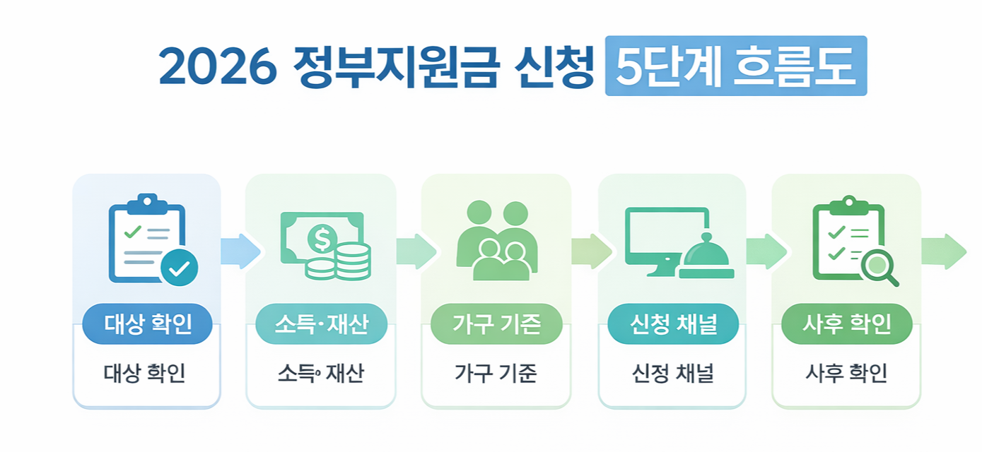 정부지원금은 자격보다 신청 순서에서 갈립니다. 대상 → 소득·재산 → 가구 → 채널 → 사후 확인, 이 흐름만 지켜도 불필요한 탈락을 크게 줄일 수 있습니다.