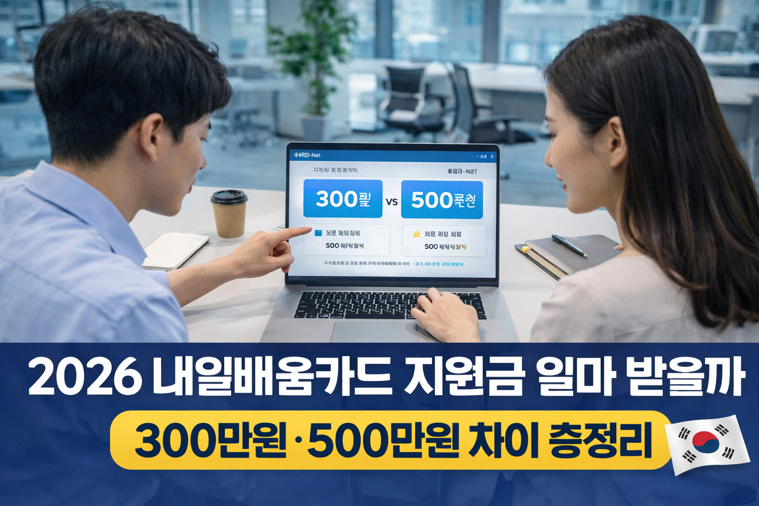 신청 방법은 알겠는데 실제 지원금이 300만원인지, 500만원인지, 또 자부담은 얼마나 나오는지 헷갈리는 경우가 많습니다. 그래서 이번 글에서는 2026 내일배움카드 지원금 기준을 중심으로 300만원과 500만원 차이, 추가지원 가능성, 자부담까지 한 번에 정리해드리겠습니다.