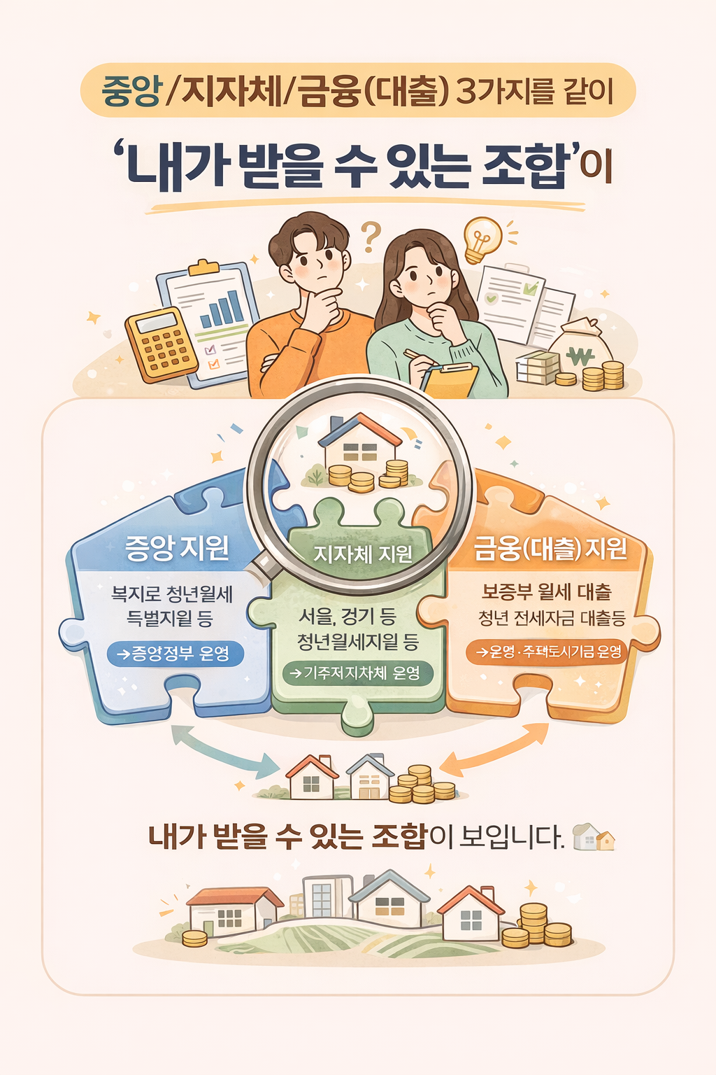 - 주거비 절감은 “현금지원 + 대출/보증” 조합: 월세지원 + 보증부 월세대출/전세대출/보증상품까지 함께 보면 체감이 커집니다