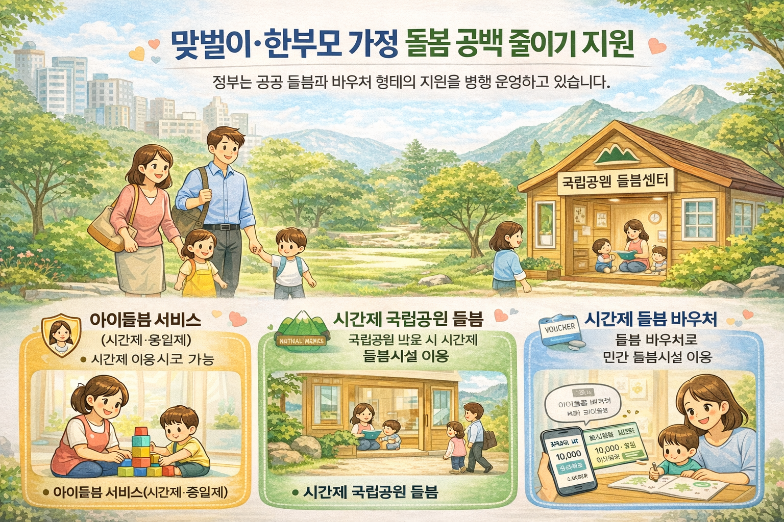 맞벌이·한부모 가정의 경우 돌봄 공백을 줄이는 것이 핵심입니다. 정부는 공공 돌봄과 바우처 형태의 지원을 병행 운영하고 있습니다.