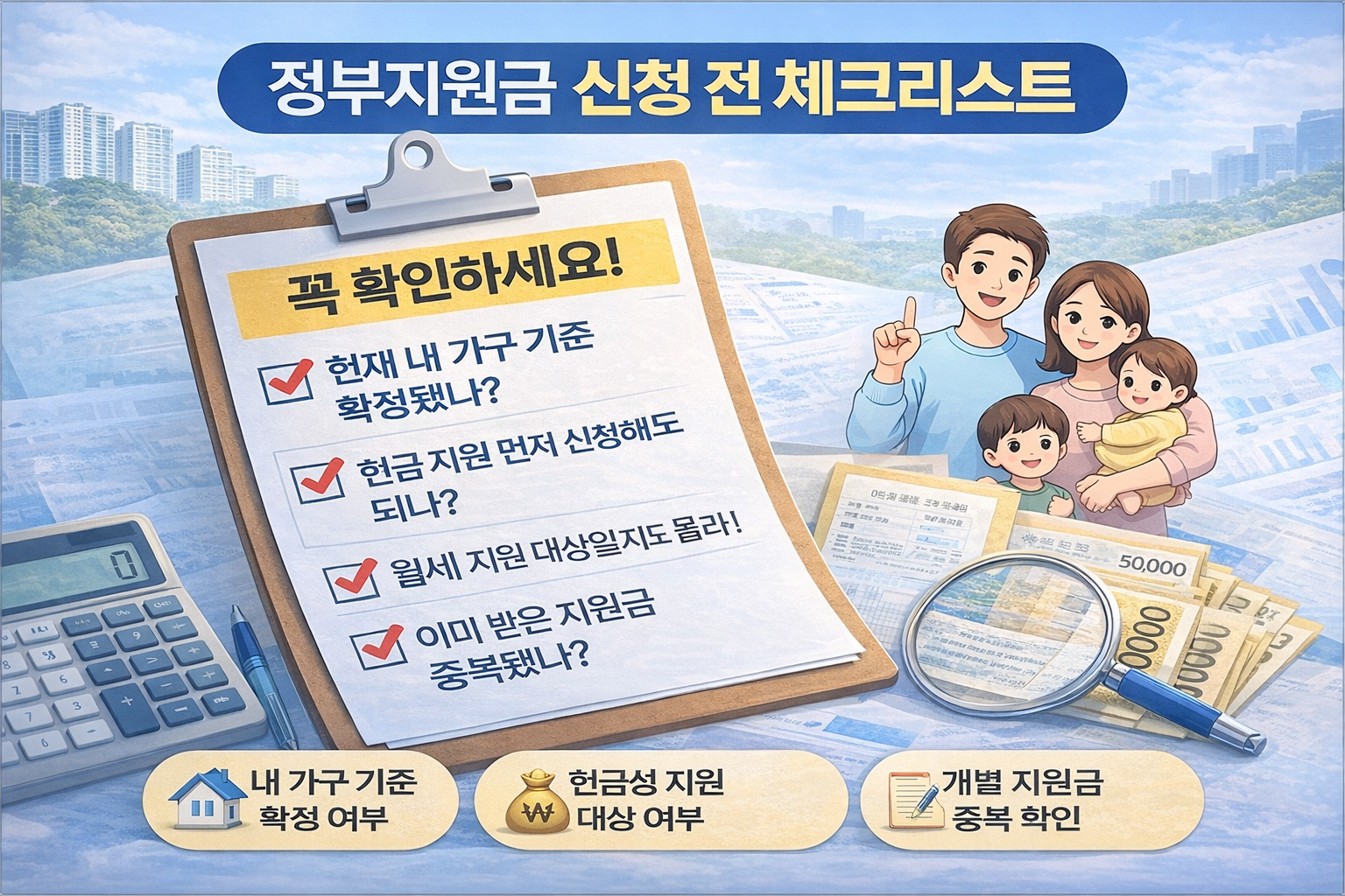 정부지원금은 자격만 충족하면 받을 수 있다고 생각하기 쉽지만, 실제로는 어떤 지원을 먼저 신청했는지에 따라 결과가 달라지는 경우가 많습니다. 특히 2026년에는 소득·가구 기준과 중복 제한이 더 촘촘해지면서 신청 순서가 탈락 여부를 좌우하는 핵심 요소가 되었습니다.