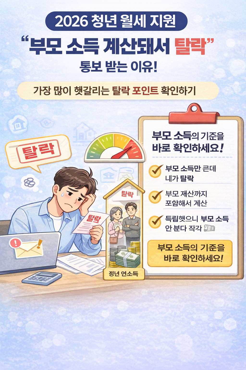 2026 청년 월세 지원을 신청했는데 “소득 기준 초과로 탈락” 통보를 받는 경우가 적지 않습니다.