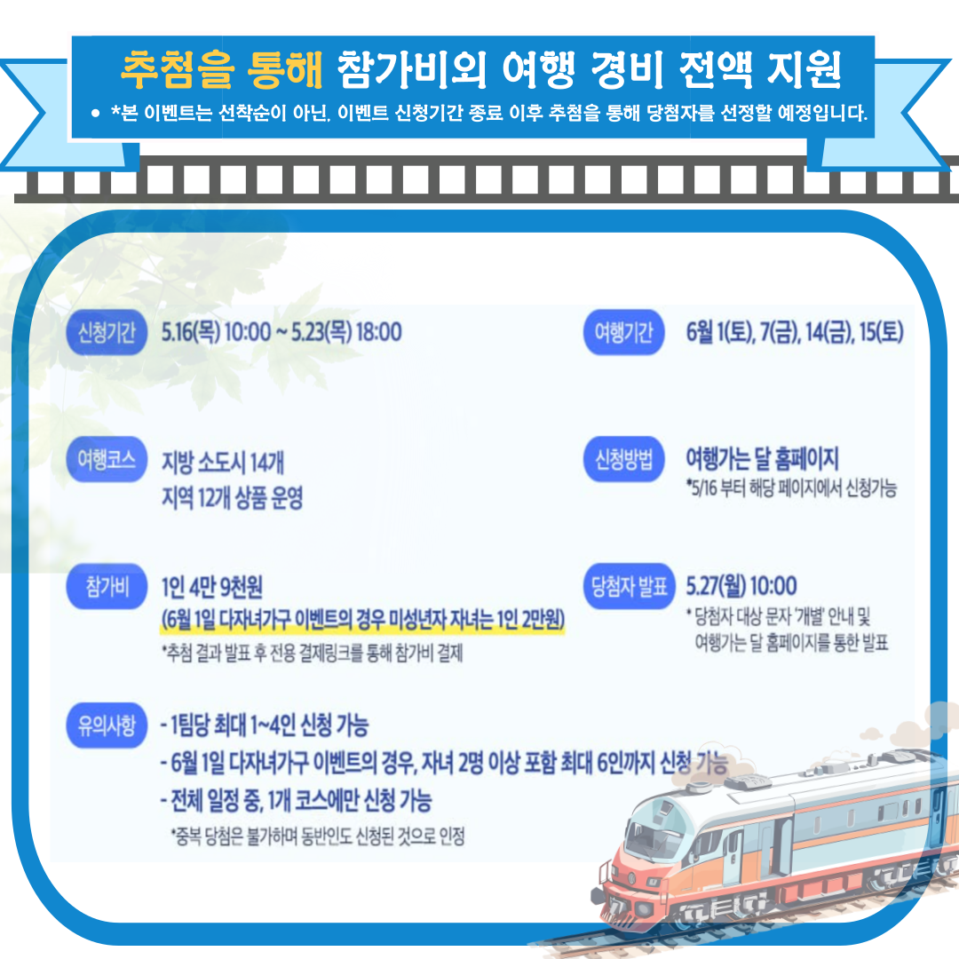 마지막으로 6월에 여행 계획 세우시고 여행경비 전액 지원받아 국내 기차 여행 다녀오시는 건 어떨까요.