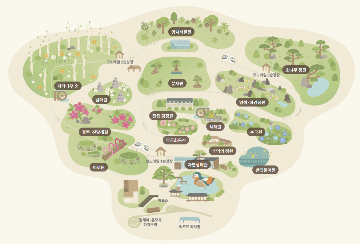 주요 테마원으로는 국내 최대 규모의 '이끼원'을 비롯해 1,000여 그루의 하얀 자작나무가 펼쳐진' 자작나무 숲 & 소망 돌탑', 명품 분재 250점을 전시하고 있는 '분재원'등이 있으며 국내 최다 품종인 480여 종의 단풍나무를 비롯해 우리 숲에서 만나 볼 수 있는 아름다운 꽃과 나무를 만나실 수 있습니다.